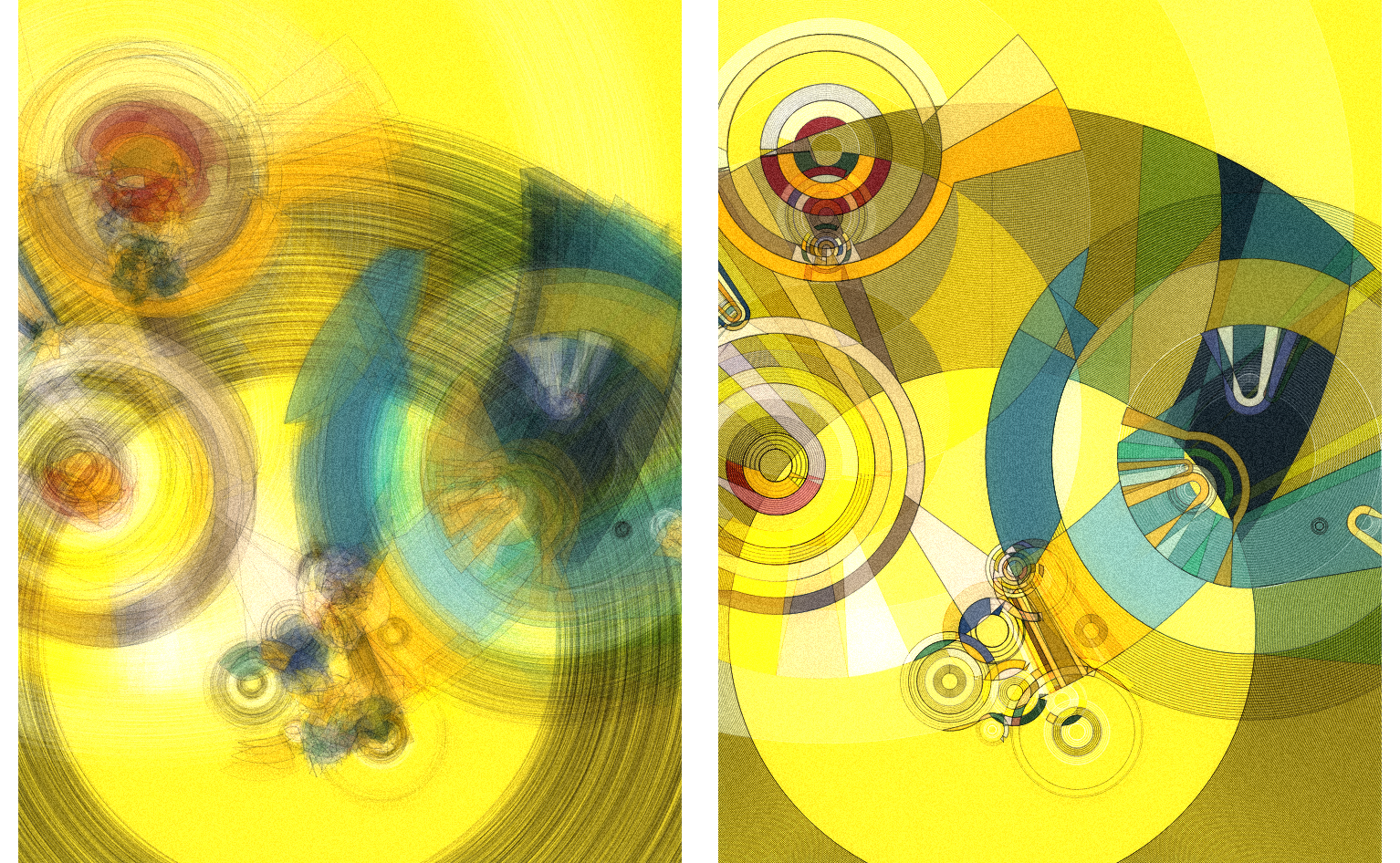 - Rings paint precision: sometimes the base rings are painted with machine-like precision. Sometimes they exhibit less perfect rendering. In certain occassions, rings are painted with much more liberty, in a loose paint style more reminiscent of undetailed passages in a human-made painting. When an artwork comes out very imprecise, it still has an option to reveal itself as what the machine would paint if it had no emotions.