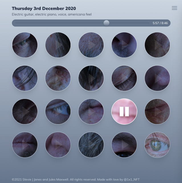 Early in 2021 I tweeted to Mario Klingemann who was experimenting with a super-early version of hic and asked him if there was any way to mint a collection of songs rather than just one at a time. He said I could upload a ZIP but it would just appear like a broken icon so it would probably be better just to upload a batch of mp3s. That was exactly what I didn’t want to do. Then the ever-awesome Mr Doob released Jumpy Dot, a functioning game inside an SVG, and the lightbulb went on in my head - I realised I could hack a single SVG file to be the 20-track player I wanted it to be! We released Fragments from The Cross, Vol. 1 just a day or two before it became possible to do HTML-based NFTs on hic, but in a way that was the defining of our earliest exposure on Twitter as @1x1_NFT. There was a bit of “how is that even possible?” and people responded so well to it. It was such a buzz. Jules and I were delighted, amazed, and just warmed to the core that people actually liked the music above and beyond the interface.
