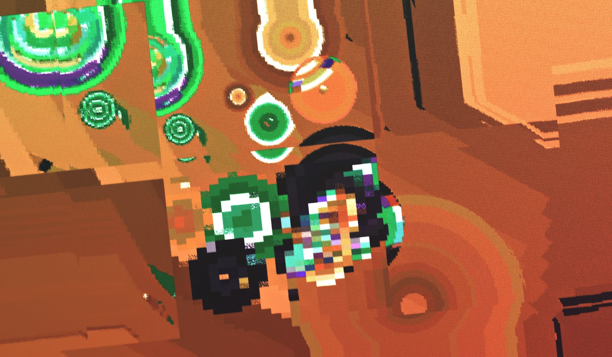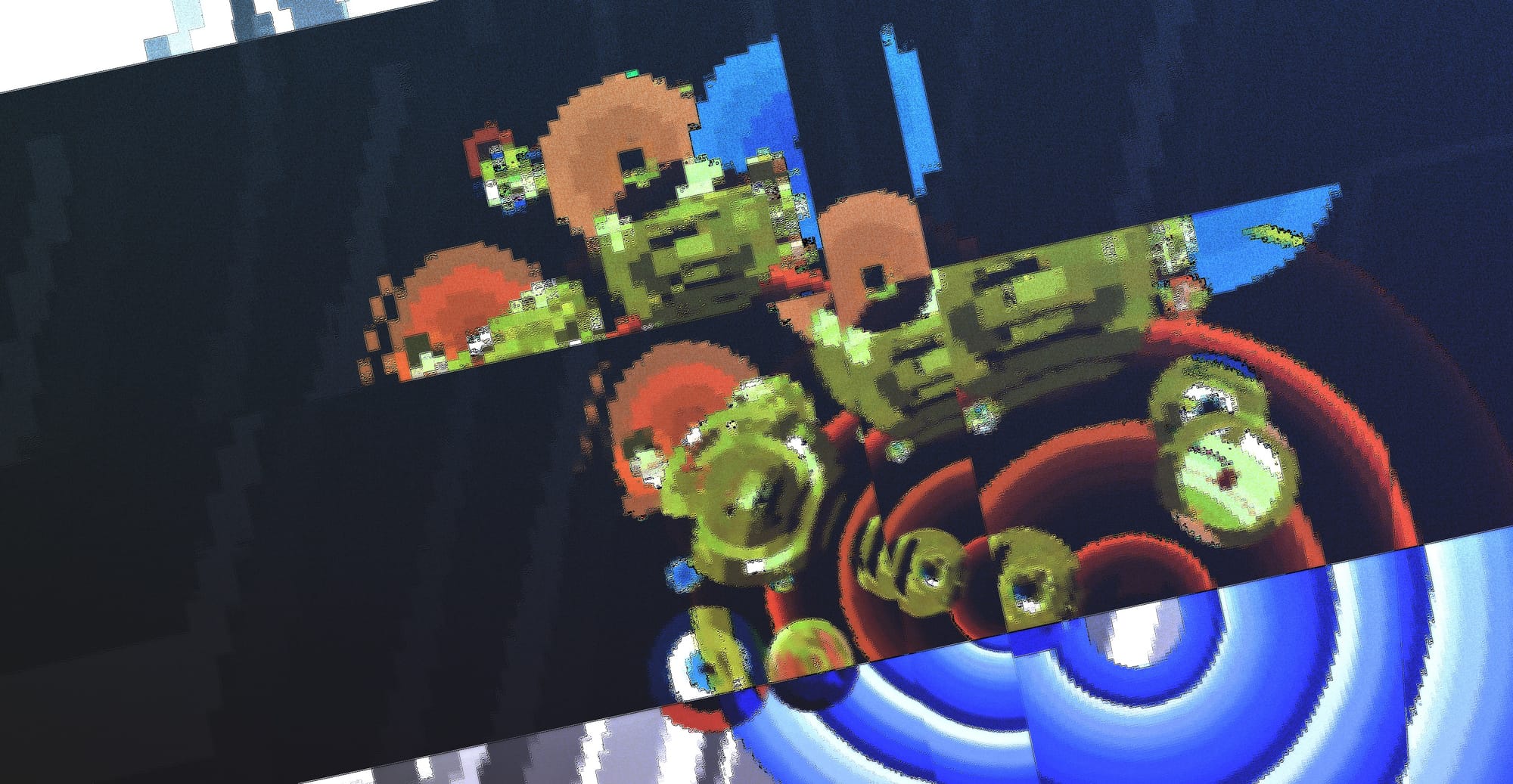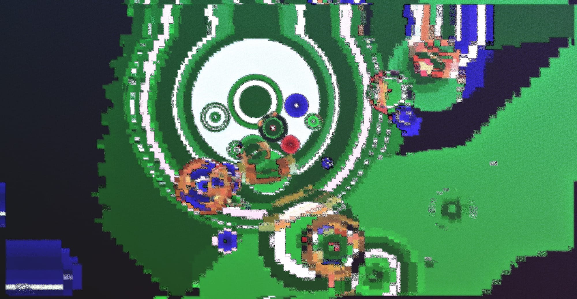 - Evolving variable spatial resolution: the work creates a non-uniform varying spatial resolution field, and it changes it in a cyclic manner and tied to the movement of one main concentric ring group (the self). Higher resolution will be centered around the self, and it will move around with it, while losing resolution (becoming a coarser representation of the underlying image) as we look further from the self center. This is a play at the fact that we can never fully see in life at full resolution in all directions, both literally and metaphorically. Human vision is detailed at the focal point, imprecise at the edges. Our perception of the events that take place around us follow the same logic: while we give our attention to a certain topic, person or moment, everything else is kept known but unattended. The work pixelates the views, again in cycles, offering views that range from broadly detailed to broadly coarse. Our emotions work in the same way: hard to describe precisely, but when in focus we can see them clearly with our inner self. The viewer / performer of the piece can alter the resolution parameter via the q keyboard command (see the controls section).